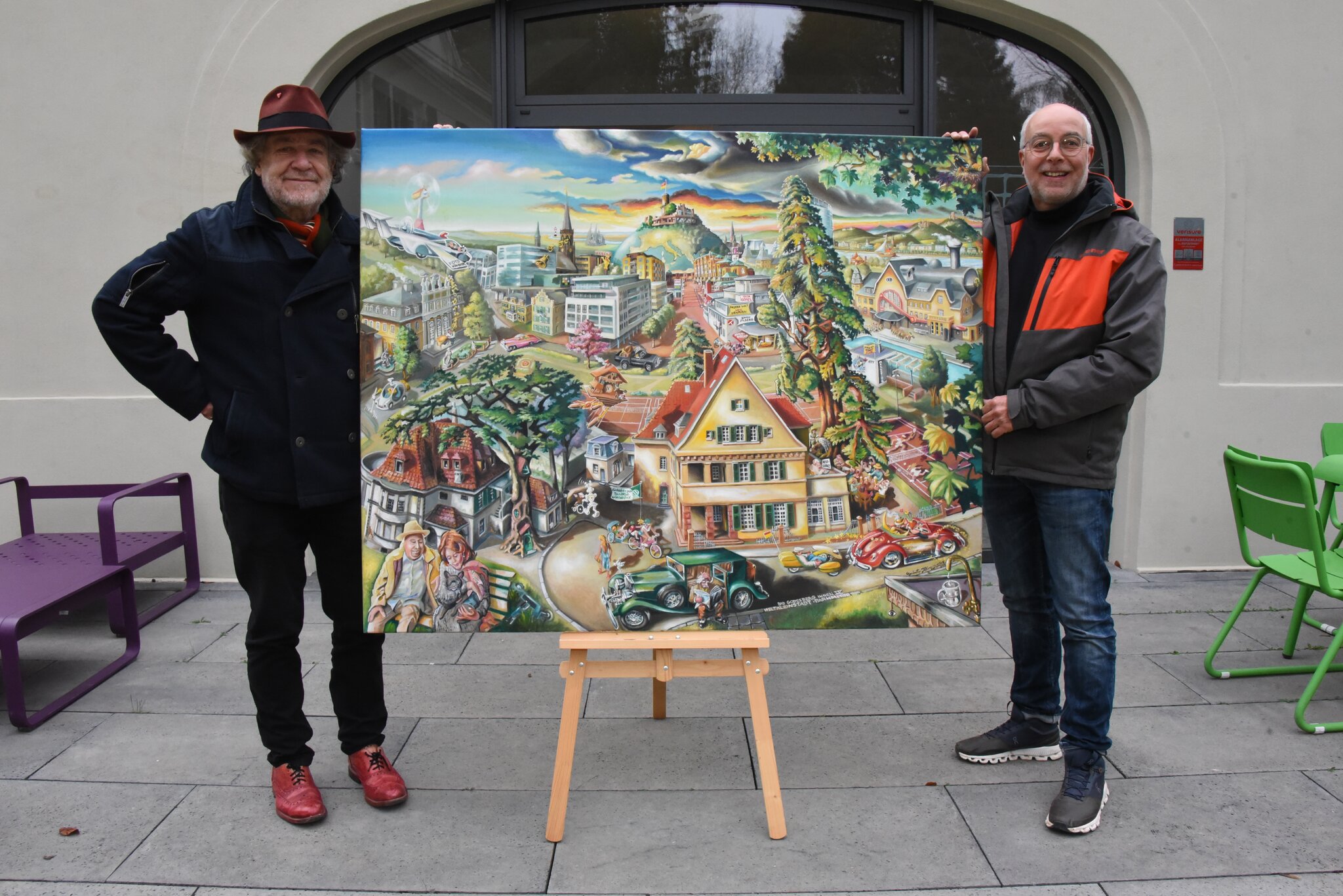 Visionen hat der Künstler auch ins Gemälde einbezogen – ein Pflegeroboter fährt eine Frau im Rollstuhl, eine autonomes Fahrzeug steht an der Redoute und ein erstes zugelassenes fliegendes Auto schwebt am Himmel. Glocken fliegen aus der Marienkirche – was eine bildliche Darstellung für die fortschreitende Kirchenkrise sein soll. Eine fliegende Kuckucksuhr steht für die bodenständige Lebens- und Arbeitswelt und Werbeschilder für das Theaterstück „Unsere Welt neu denken“ zieren die Wand des Schauspielhauses.